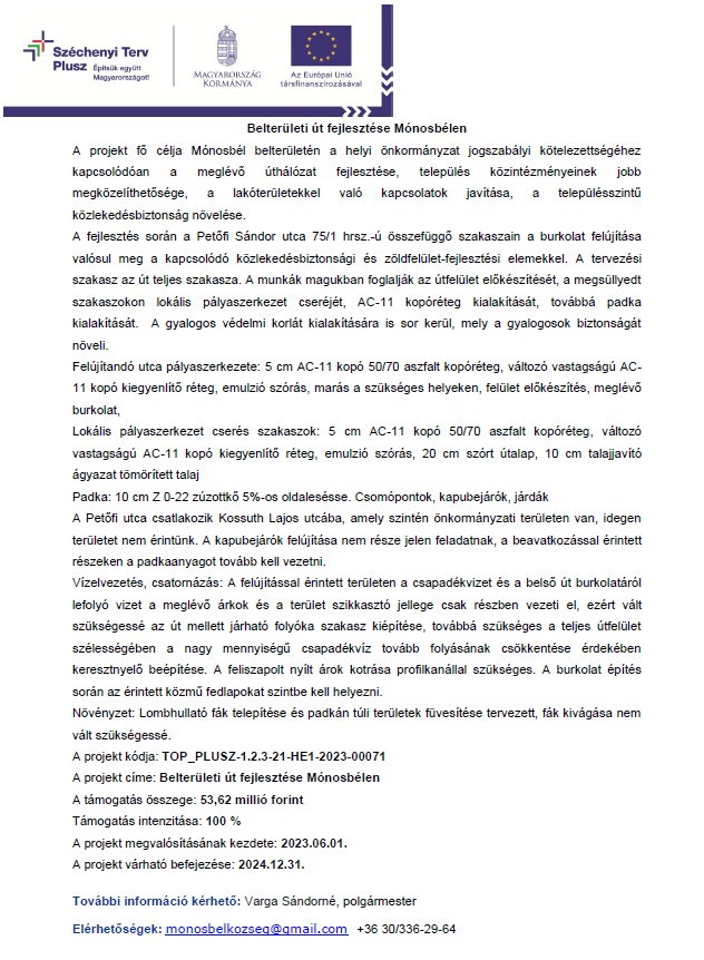 Pályázatok Belterületi út fejlesztése MónosbélenBelterületi út fejlesztése Mónosbélen Attachments: Belterületi út fejlesztése Mónosbélen[ ]131 kB